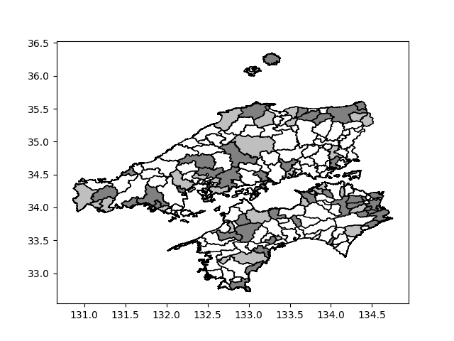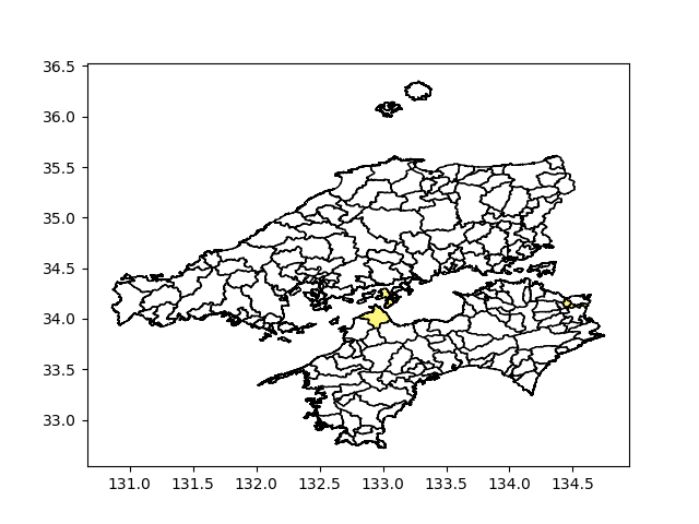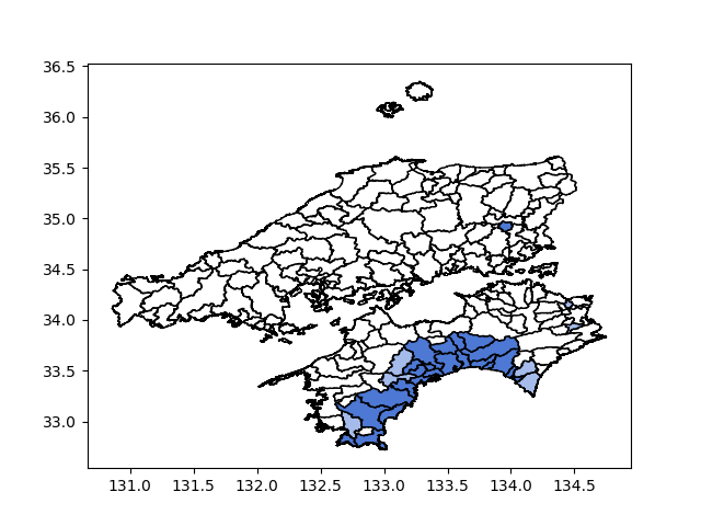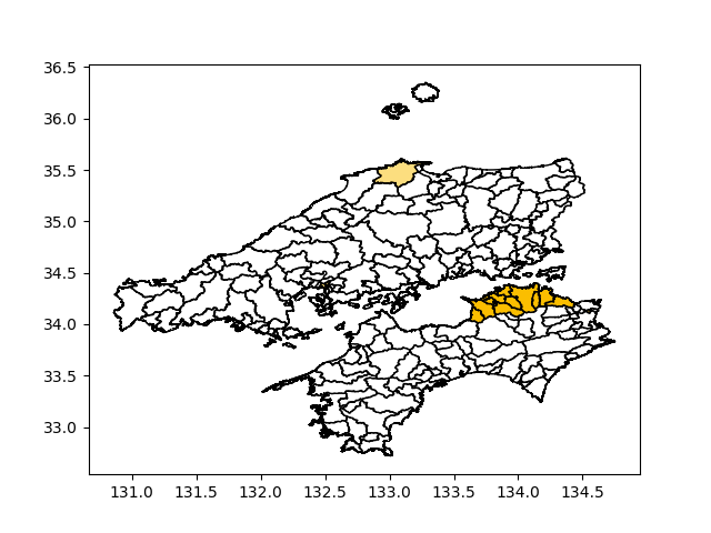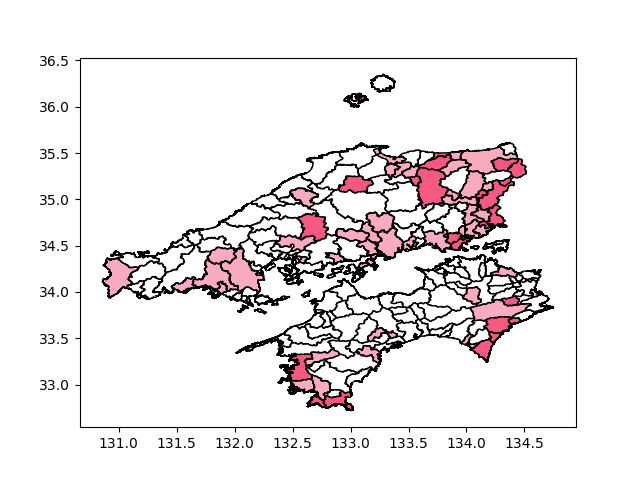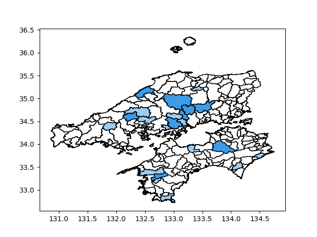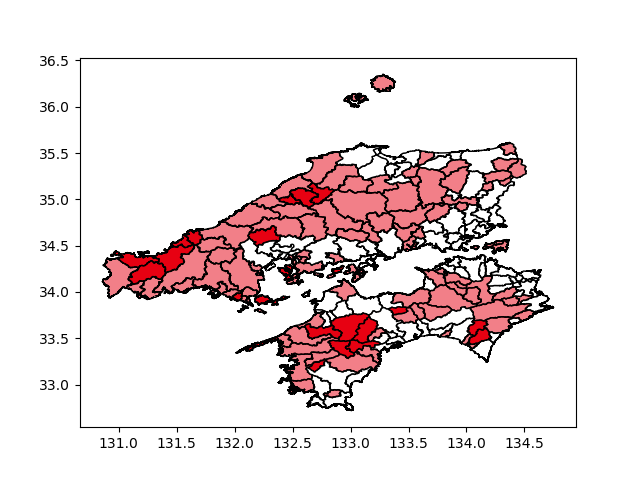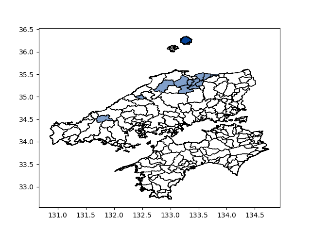鳥取県・島根県の県境あたりの市町村で高い得票率となっていました。このあたりの宍道湖や大山に関連した1次産業の団体が影響しているのでしょうか。